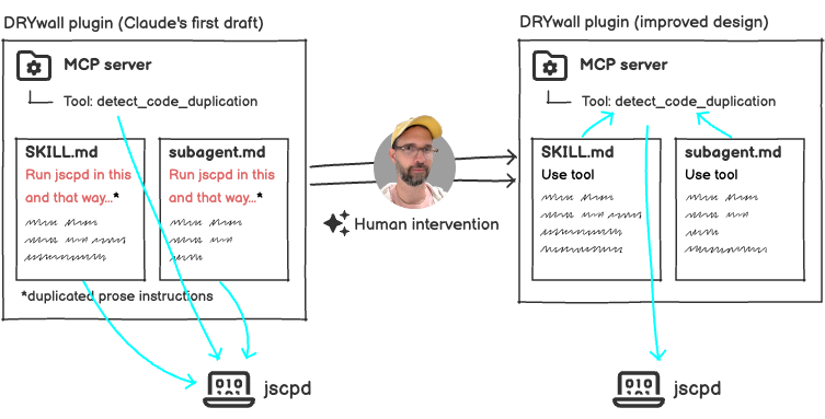 Maybe an anecdote will calm some anxious minds. Obviously I leaned on Claude to draft an initial version of DRYwall with its three components: a skill, a subagent and an MCP server with a tool proxy for jscpd. When I tested and reviewed that initial version I realised that Claude had written elaborate prose instructions for how to call jscpd in the skill file and again in the subagent file. Yes, it had duplicated “code”—really prose, which was even worse. This despite the MCP tool, which already calls jscpd in a structured way, sitting right there for the taking. I had to prompt Claude to rewrite the skill and subagent to use the MCP tool for much more deterministic behavior (and less duplication).