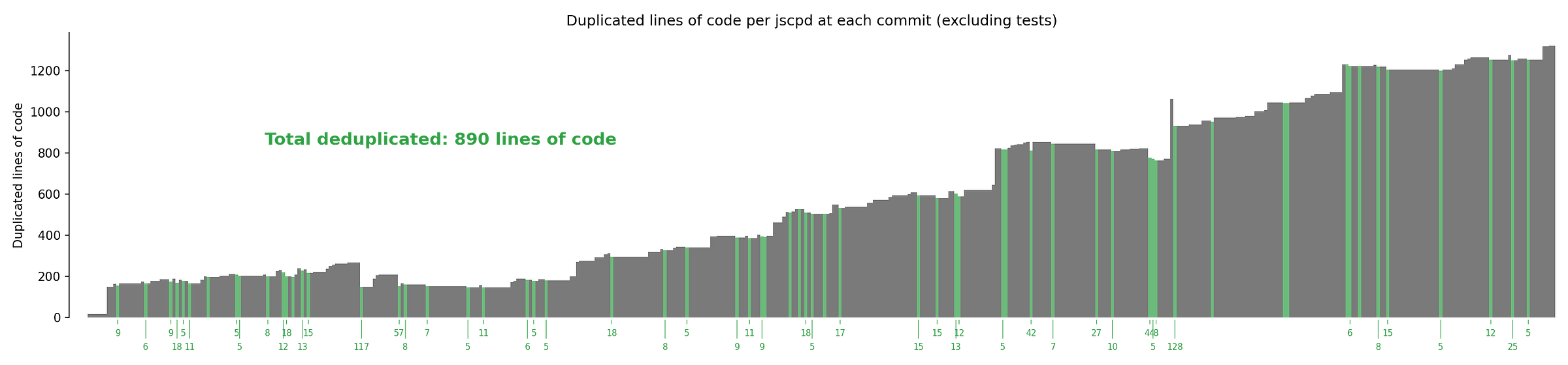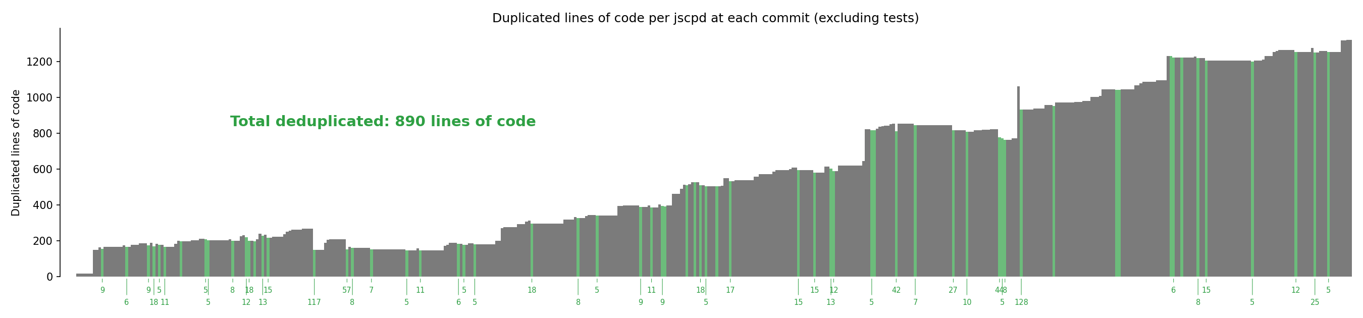 This plot shows the number of duplicated lines across the whole codebase at every commit (as per jscpd2), with deduplicating commits highlighted in green: