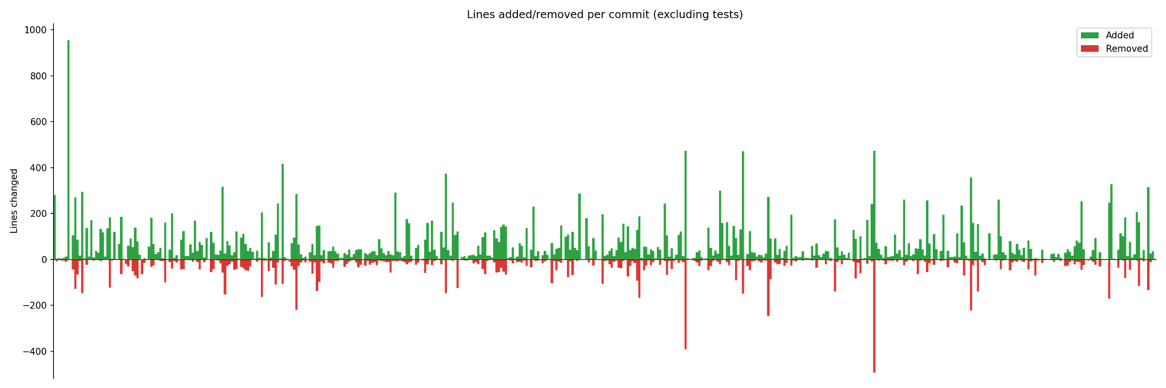 This is just to show that progress was pretty uniform over time. There were no massive spikes in either code added or removed—as you would expect from trunk-based development that values small-ish self-contained changes.