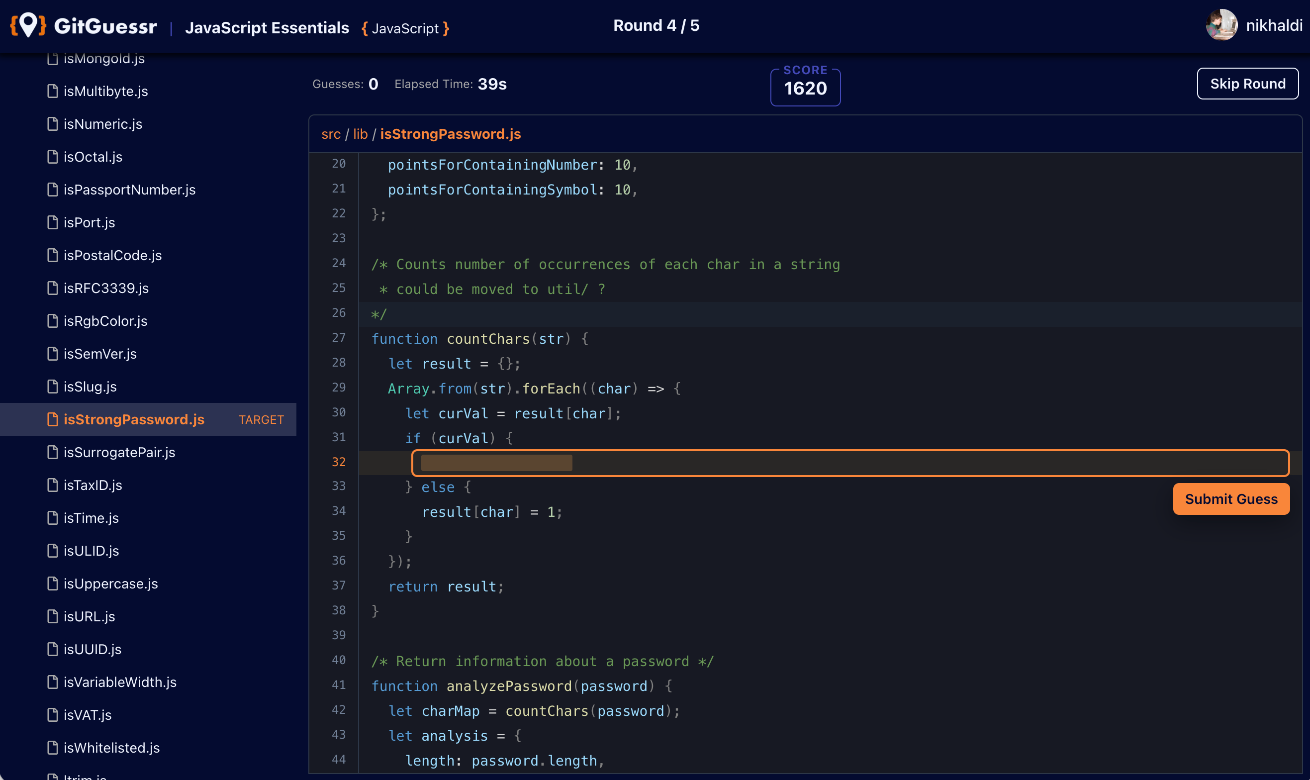 I’d been hatching an idea while I was traveling over Christmas and New Year, and like any half-decent and therefore cheap idea it’s easily explained: GeoGuessr but for code in GitHub — a game where you are dropped into a random location of a public GitHub repo with a few lines of code masked that you have to guess to score points.