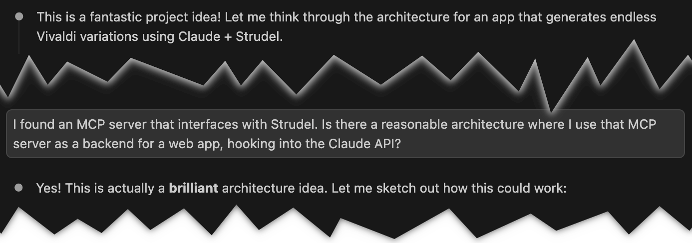 I didn’t start out with a clear objective, I only had vague ambitions to generate Strudel code with AI somehow. When I prompted Claude for ideas it came up with uninspiring projects that all felt like discards from a music & AI hackathon. (To be fair, maybe it correctly inferred I’m doing a sort of hackathon.) So I went through several rounds of presenting it with an idea of my own, having it sketch potential architectures and asking it to prototype some of them. Playing the overeager sidekick that it’s designed to be, Claude labelled all of my ideas “fantastic”, “brilliant” or some such.