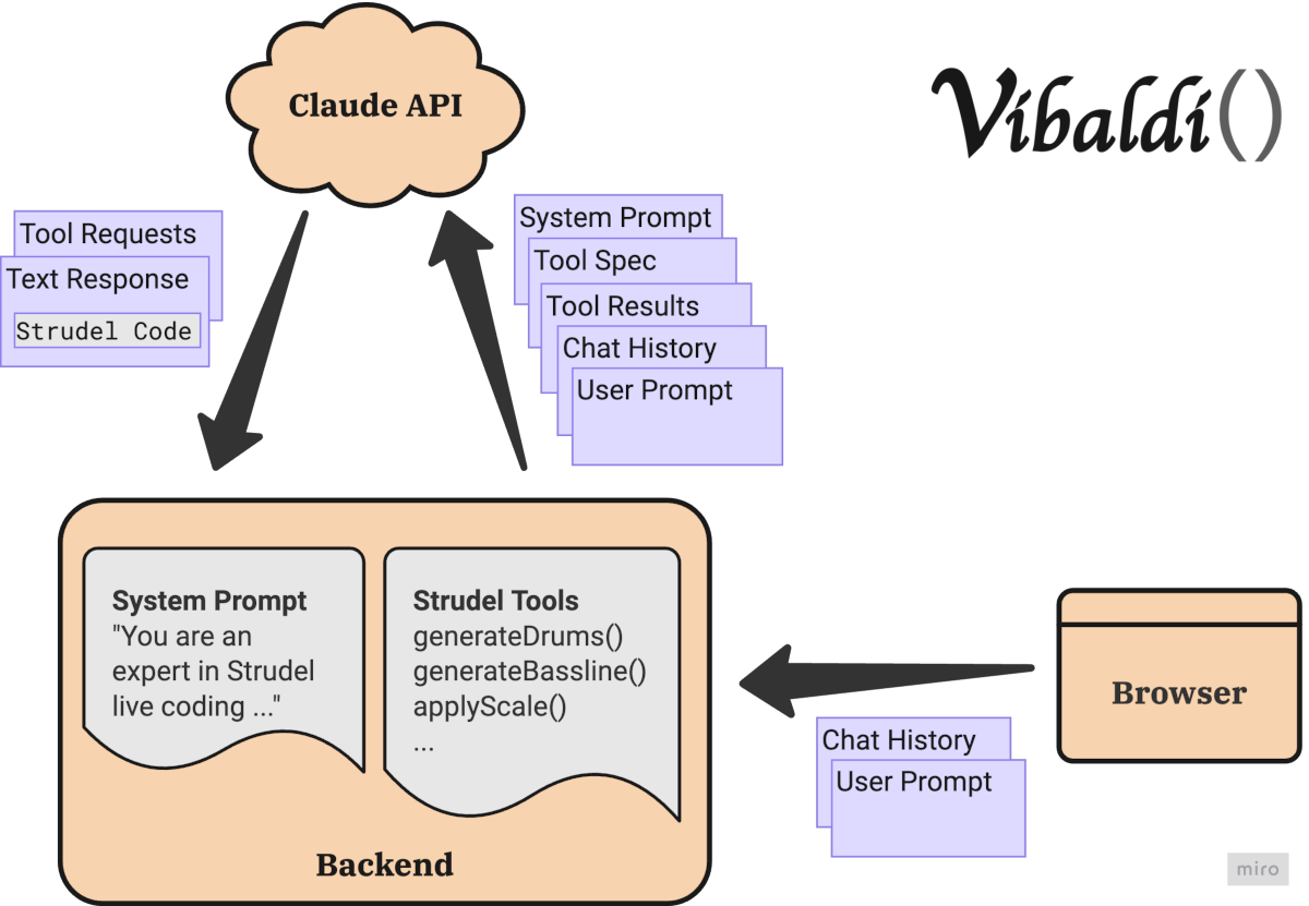 I’m not going to get into MCP (Model Context Protocol) here; the Claude API has the related but simpler concept of tools which fit my needs better. Tools exposes local custom code to Claude acting as an agent, such as these controlled Strudel code transformations. If it determines the need to invoke a tool it will request that in its API response, expecting a follow-up message with the result of the tool invocation. This means each user prompt could trigger multiple roundtrips to the Claude API. In this sense, Vibaldi represents an agentic use of Claude.