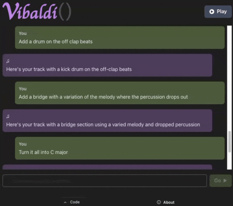 In this issue: Vibaldi, a chat interface to make music. The impatient can just check it out—but please read on for commentary.